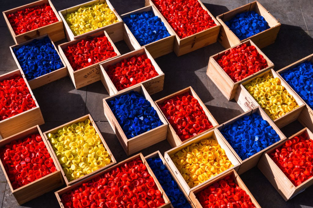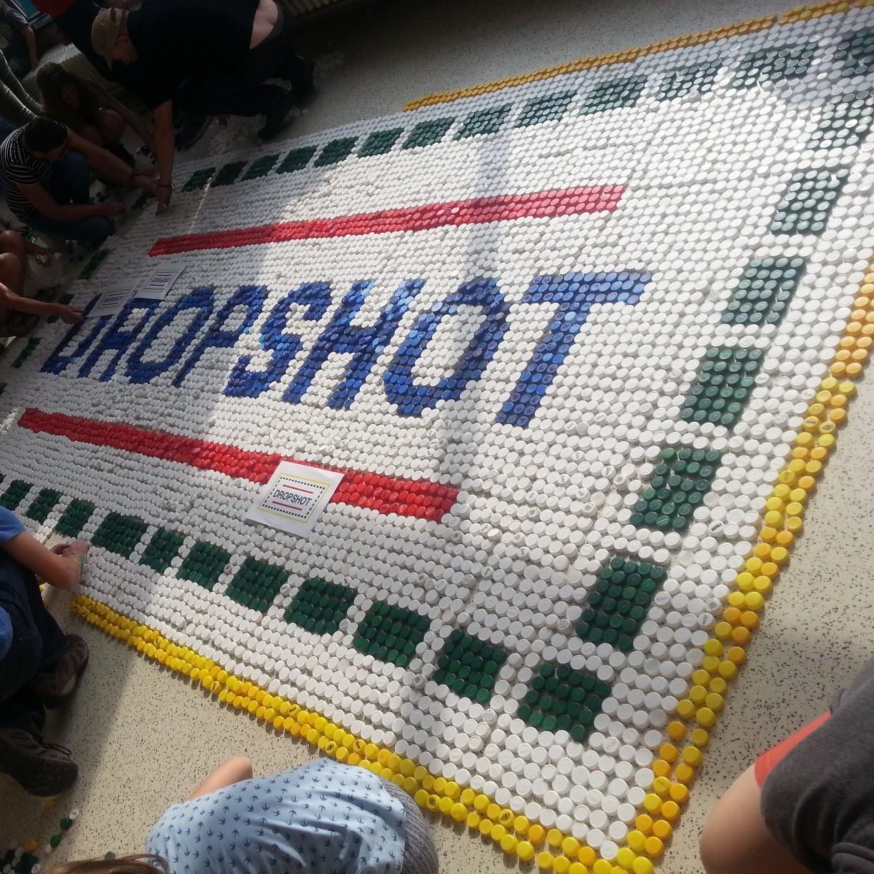 Wij verzamelden honderdduizenden per kleur gesorteerde plastic drankdoppen. Leg een tapijt van het logo van je bedrijf in gekleurde doppen. Of creëer een QR-code met enkel zwarte en witte doppen en promoot je bedrijf of organisatie.